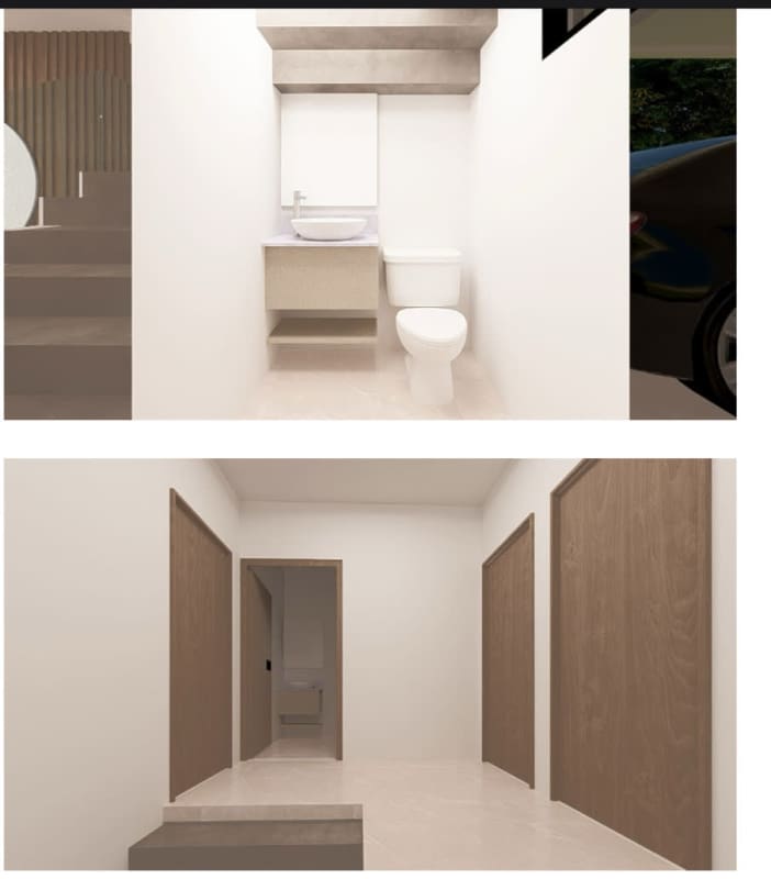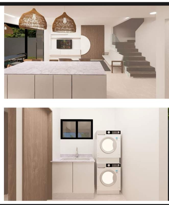 En el primer piso, la casa cuenta con sala, comedor y cocina integrada, alacena, terraza con jardín y piscina propia, medio baño, parqueo para dos vehículos bajo techo, tanque de reserva de agua.,