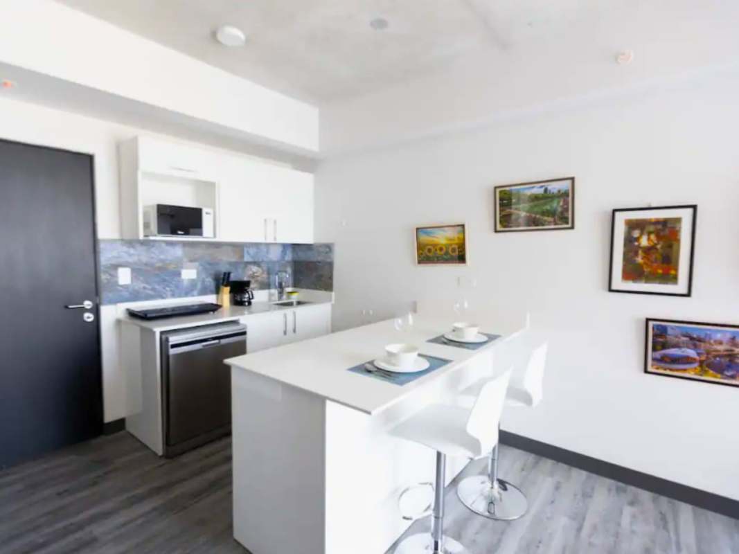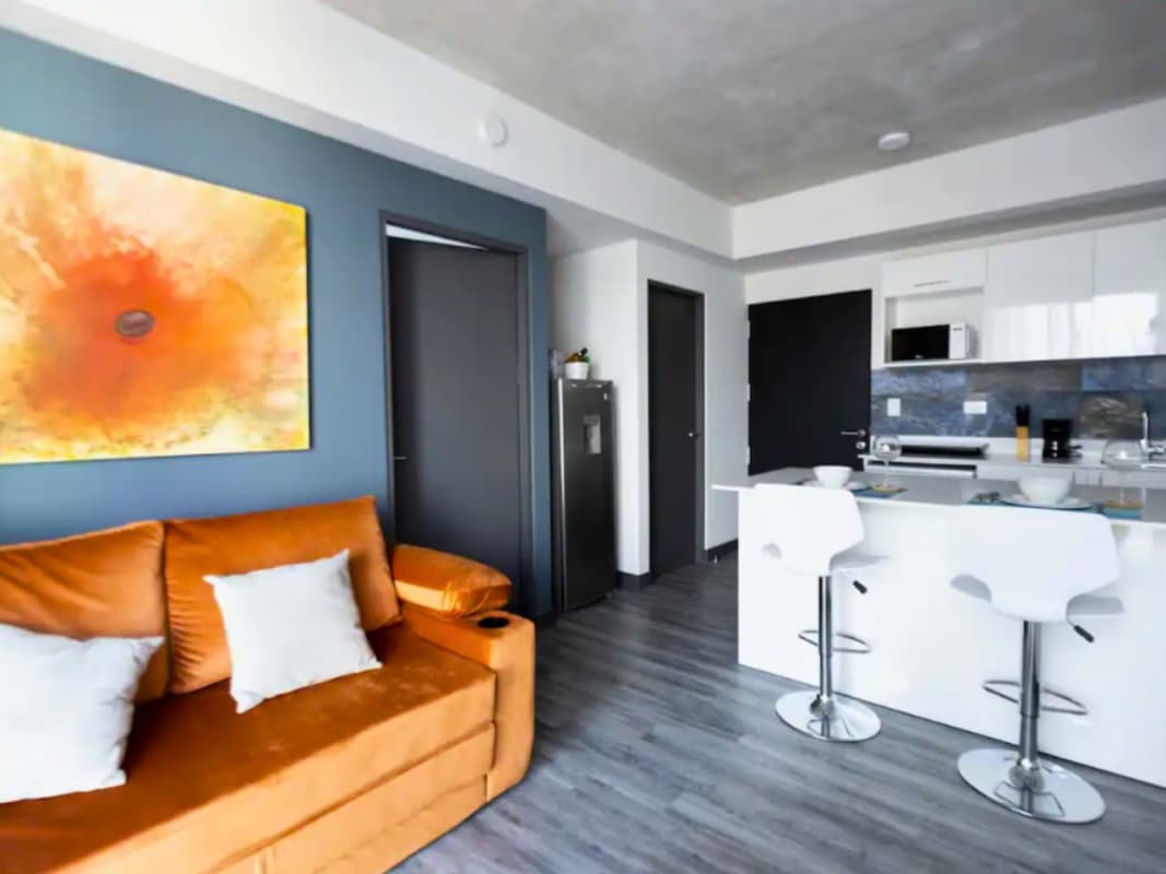 Al ingresar al apartamento, encontrarás una cocina completamente equipada que se conecta con una sala de estar luminosa y acogedora. La cocina ha sido diseñada de forma funcional y cuenta con gabinetes modernos, superficies de calidad.