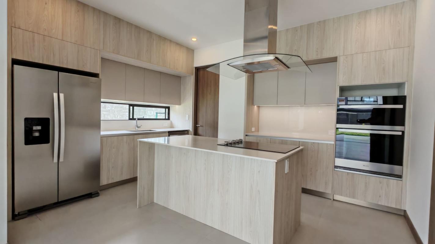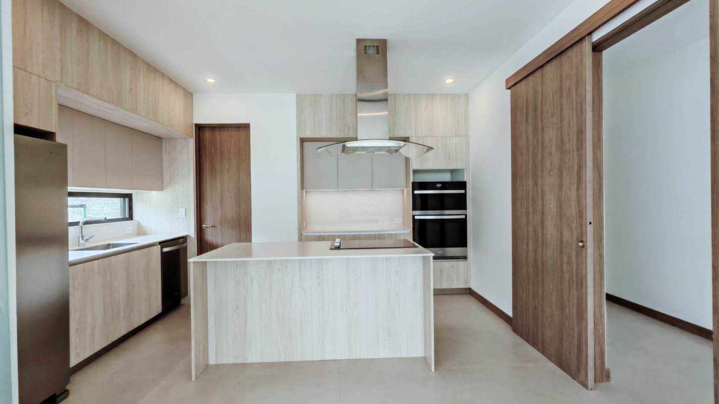 - Cocina con buen espacio para almacenamiento, equipada con electrodomésticos de excelente calidad (refrigeradora, extractor, plantilla, torre de horno y microondas).