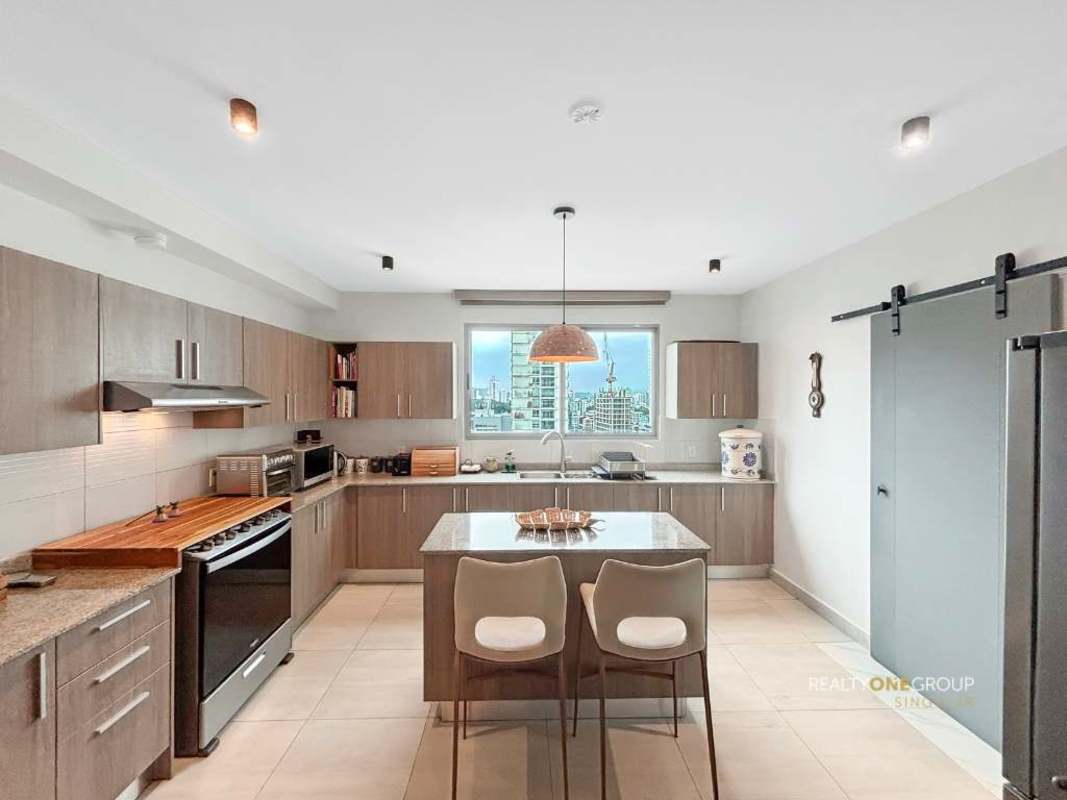 The open-concept kitchen combines design and functionality, featuring a central island ideal for family gatherings or entertaining friends. It comes fully equipped with ample storage, granite countertops, and an “L” layout that maximizes space. It also includes a laundry area, maid’s room, and bathroom.